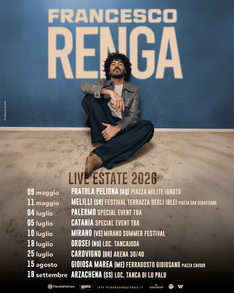 Gli appuntamenti estivi anticiperanno “LIVE TEATRI 2026”, la tournée nei principali teatri italiani prevista tra ottobre e novembre. Le date – prodotte da Friends & Partners – vedranno Francesco Renga protagonista di “LIVE ESTATE 2026”: si parte il 9 maggio 2026 da Piazza Milite Ignoto a Pratola Peligna (AQ), per poi proseguire l’11 maggio a Melilli (SR), al Festival Terrazza degli Iblei in Piazza San Sebastiano. Il tour continuerà il 4 luglio a Palermo, il 5 luglio a Catania, il 10 luglio a Mirano (VE) per il Mirano Summer Festival, il 18 luglio nella località TancaIdda di Orosei (NU) e il 25 luglio a Carovigno (BR), all’Arena 30/40. Dopo la tappa del 15 agosto a Gioiosa Marea (ME), in occasione del Ferragosto Gioiosano in Piazza Cavour, il calendario si concluderà il 18 settembre ad Arzachena (SS), nella località Tanca di Lu Palu.